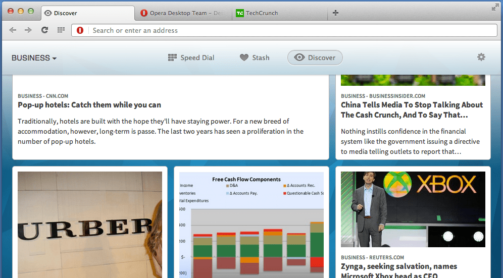 There are a couple of new features, a Discover tab very reminiscent of Google News with a Pinterest UI, a Stash tab that works like Safari’s “Reading List”. Opera Turbo is still there, but it’s now called the off-road mode.