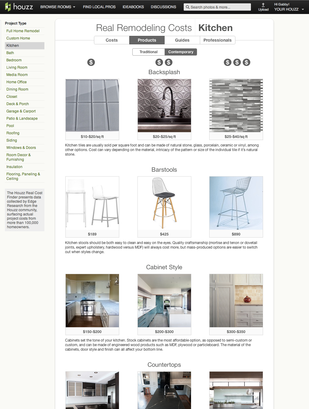 For example, the tools show homeowners what a kitchen or media room remodel costs in their area. Besides the average, which wouldn’t be all that useful, it also highlights the stats for the lower, middle and top third. Using its existing database, Houzz can also draw upon its huge database of envy-inducing photographs and prices for specific items. This way, for example, you can see what a certain kind of countertop will do to your budget, as well as the pros and cons of the different options, thanks to the growing number of how-to and style guides on the service.