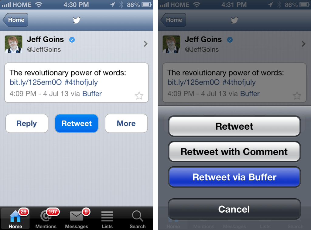 “A big pain point that a lot of people have told us about and that I personally also often run into often is that there’re too many good Tweets,” Buffer co-founder Leo Widrich wrote in a blog post today. “I have tons of great people I follow on Twitter and I want to reshare their Tweets. Doing so once is great, but 3-4 times in a row quickly overwhelms my timeline. So instead, with Echofon, you can now just hit the ‘retweet with Buffer’ icon and it’ll be scheduled for you well spaced out over the day.”