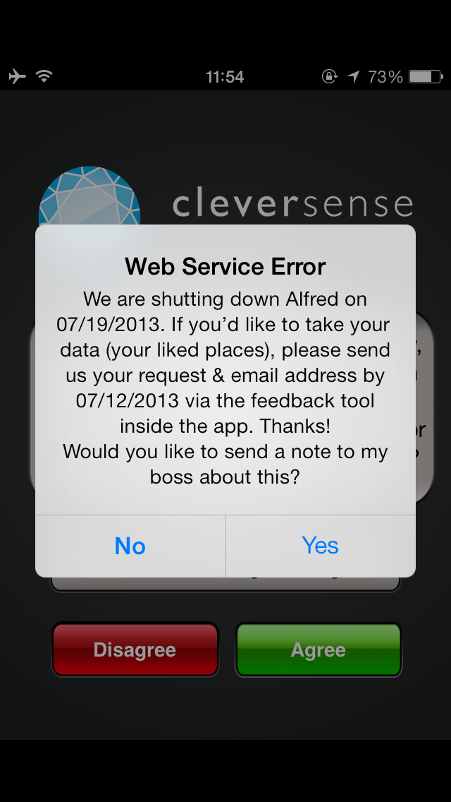 Looks like Latitude wasn’t the only Google product that got shut down yesterday in the wake of a new version of Google Maps. Alfred, the local recommendations app that Google picked up through its acquisition in December 2011 of developers The Clever Sense, is getting shut down on July 19.