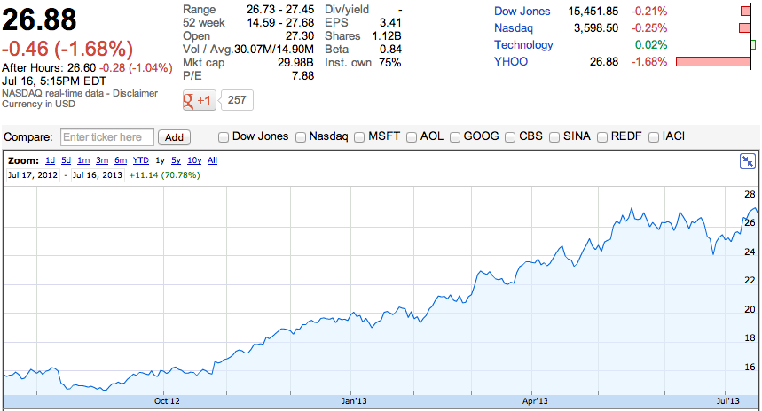 For the past twelve months, Yahoo shares have been doing very well. With a share price of 15.65 on July 16, 2012, today’s price of 26.88 represents an incredible 71.8 percent increase in just a year. That’s better than Google, Apple or eBay.