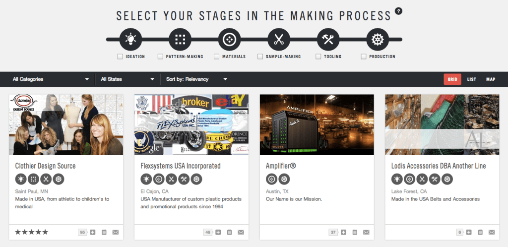 Maker’s Row offers a kind of proto-Alibaba for U.S. businesses. Those who are in the market for either materials or factories to execute a product can go to the site, where they can search by category (currently these include ideation, pattern-making, materials, sample-making, tooling and production) or keyword (below I’ve typed in “zipper”) and you get in return a selection of results, laid out in a visual, grid-style pattern so that you can start looking a bit closer and refining.