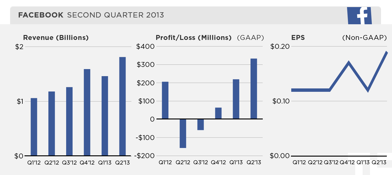 Facebook’s second-quarter revenue is up 53 percent on a year-over-year basis. Analysts had expected a 37 percent increase. In the quarter, Facebook had a net income of $333 million. In its most recent sequential quarter, the first of 2013, Facebook’s revenue totaled $1.46 billion, and it earned $0.12 per share.