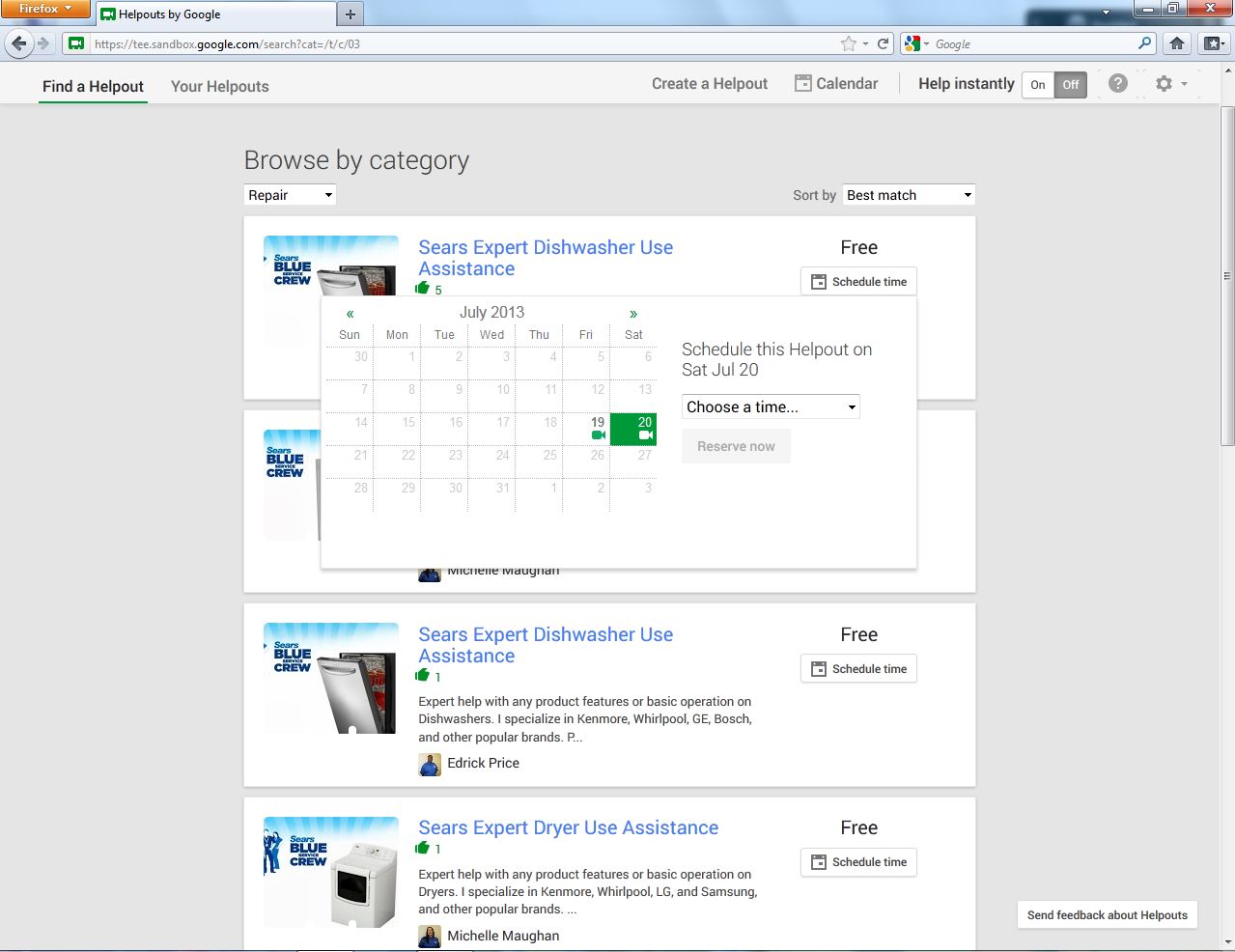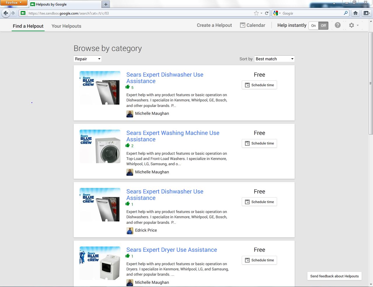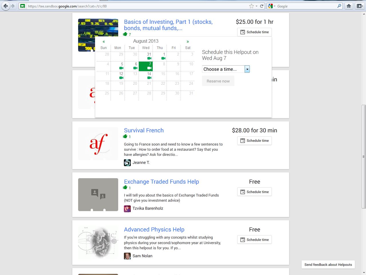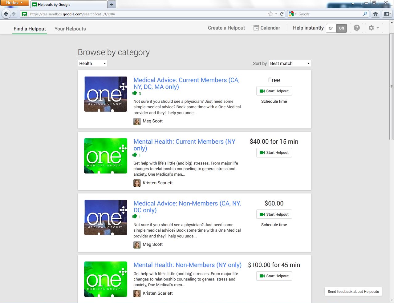 Google has also apparently partnered with a number of brands during internal testing, including One Medical Group, Sears, Weight Watchers and Alliance Frances, for example. At launch, the platform will also reportedly include an array of individual merchants and instructors as well, from yoga gurus to fitness teachers — all of whom will be able to offer both free and paid services to consumers via Helpouts.