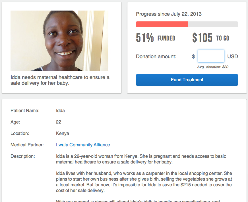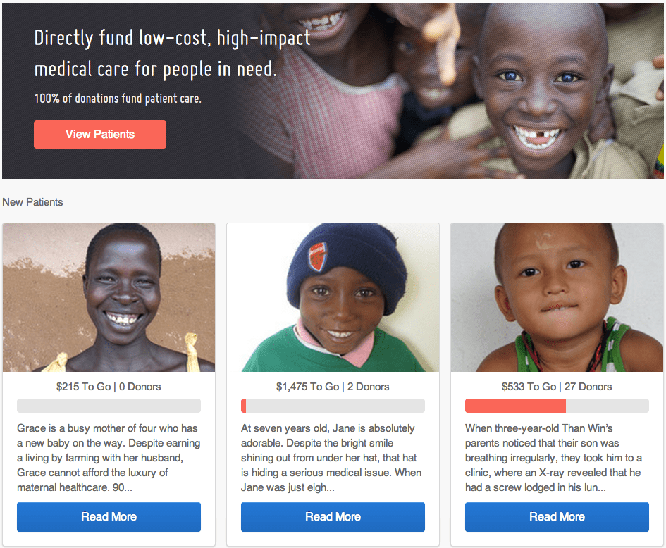 Furthermore, the platform automatically creates profiles for those in search of financial support for treatments or surgeries and makes it easy to make direct donations. Furthermore, these profiles, besides providing critical transparency into how your donation will be used and actually help someone, it also works towards attaching actual, human faces to global poverty — which sounds cheesy but is critical to conditions or problems like this that are so huge that providing real faces, one-by-one, can help discourage, say, just ignoring it and hanging for a lower-hanging fruit.