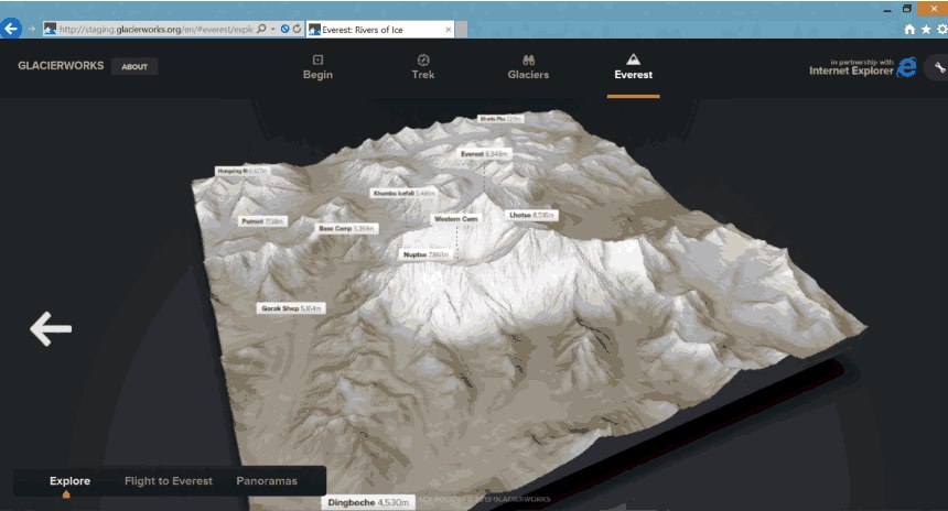 To show off IE11’s WebGL features, the company teamed up with GlacierWorks, a site that aims to raise awareness about the effect of climate change in the Himalayas, to add more WebGL content to its site.