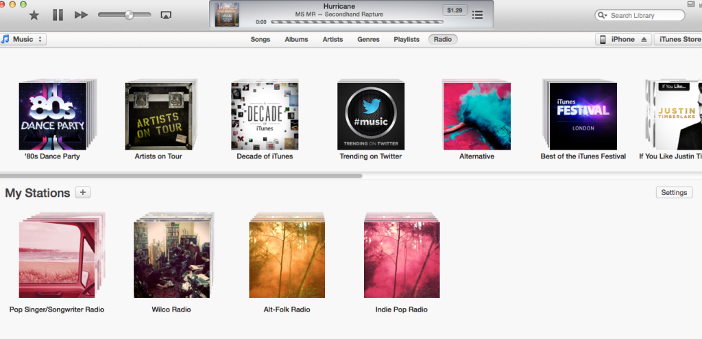 On the desktop, iTunes Radio looks to operate pretty much the same as it does on mobile, providing access to some pre-set stations and letting users create their own. The interface is remarkably minimal for now, but Apple has left lots of room for custom stations. There’s also a button to let you buy songs being played back instantly in the “Now Playing” window, as you can see in the screenshot below provided by an anonymous tipster.
