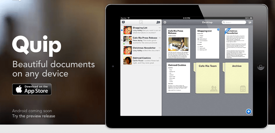 Quip looks polished, which makes sense considering Taylor specifically left Facebook in June 2012 to start the company with Kevin Gibbs, the father of Google Apps Engine. Taylor redirected his backchannel.org site to Quip.com in December 2012, revealing the startup’s name to the world. While no details were released, our own Ingrid Lunden sniffed out that it might be a collaborative writing app based on the pen in the app’s icon and a patent for cloud collaboration awarded to the startup.