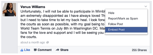 Bleacher Report, CNN, Huffington Post, Mashable and People are the first sites to be allowed to embed Facebook posts, but soon the drop-down arrow on news feed and Timeline posts will include an “Embed” option that lets you copy the HTML into any site or blog. That’s still a bit clunky, considering some sites like WordPress can render Twitter embeds from simply pasting in a tweet’s permalink.