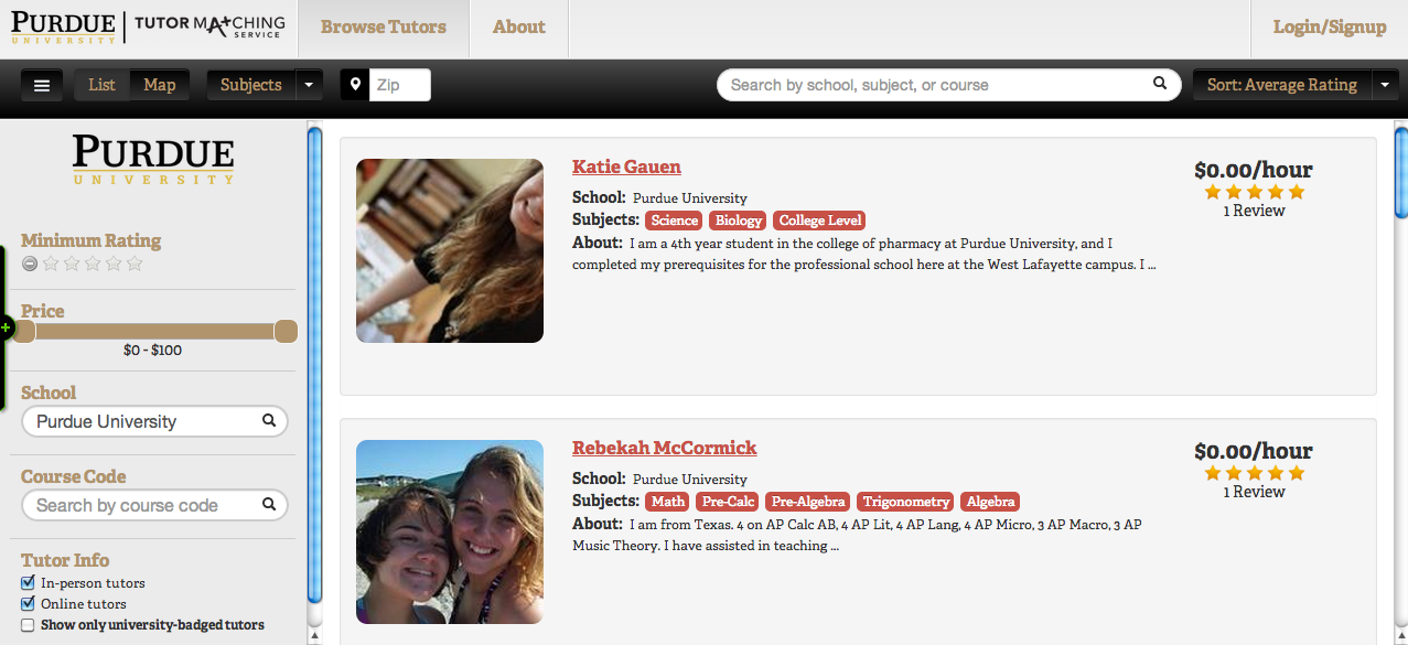 Schools want to improve student graduation and success rates, and one-on-one tutoring is a great (and effective) way to do that, however, at most colleges and universities, there are few tutoring options for upper level chemistry, physics, math, languages and so on. College learning centers are asked for help in this regard by parents and students all the time, so Tutor Matching Service began by piloting (and sponsorships) from the career centers, learning centers and student governments of schools like CalTech, Purdue, NYU Poly and Kent State University.