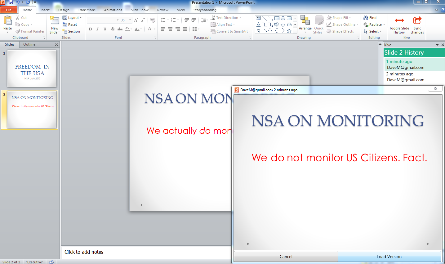 In its current version, Kivo allows you to sync documents and track changes on a per-slide basis. The tool integrates itself with PowerPoint and it just takes a few clicks to sync a new version to Kivo’s servers or to restore an older version from Kivo’s repository. The basic idea here is to ensure that users never again have to share files with names like presentation_v4_final_final.ppt.