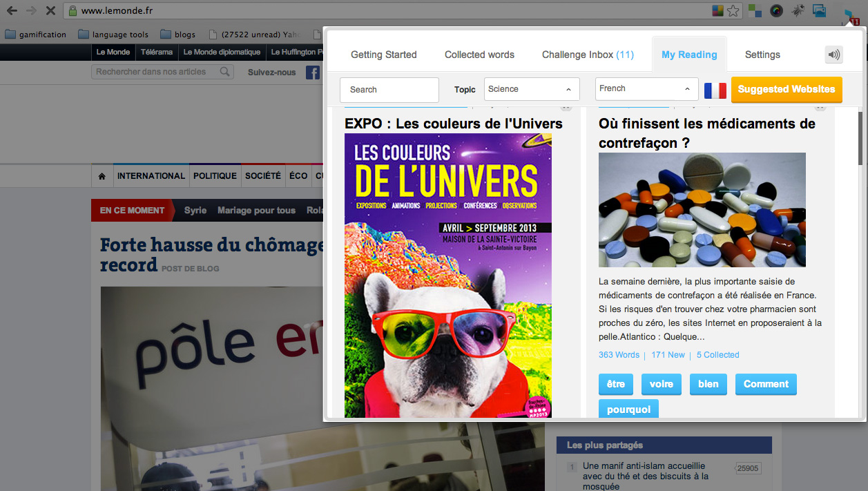 Lingua.ly is a Chrome plug-in, so it’ll automatically prompt you to take new quizzes, personalized for you, as you browse the web. You can also use the plug-in to get recommendations for texts that are appropriate for your reading levels and mark up texts or browse Lingua.ly’s dictionary as you visit any site on the web.