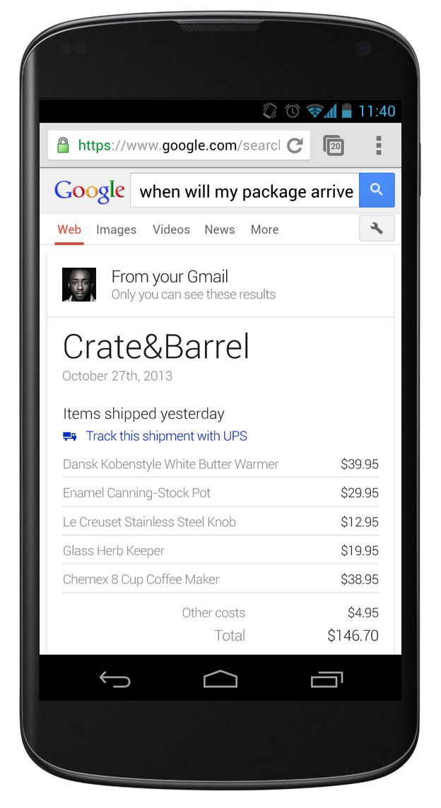 Google today announced a number of search features that make it easier for you to find your own personal information through Google Search. The search engine can now find information about your upcoming flights (“Is my flight on time?”), hotel or OpenTable reservations, package delivery information (“When will my package arrive?”), your purchases and what’s on your calendar. Just like on Google+, you can also now use the regular Google search to find your own photos through queries like “Show me my photos of beaches.”