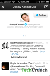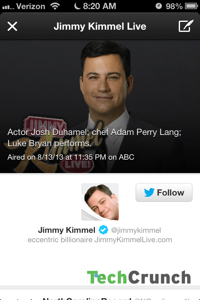 The click-through feature, meanwhile, provides not only a link with more info about the TV show, but also through to accounts that might be relevant to fans of that show. In the example here, Jimmy Kimmel Live also provides a link to the official account of Jimmy Kimmel himself, as well as a list of tweets related to the show.