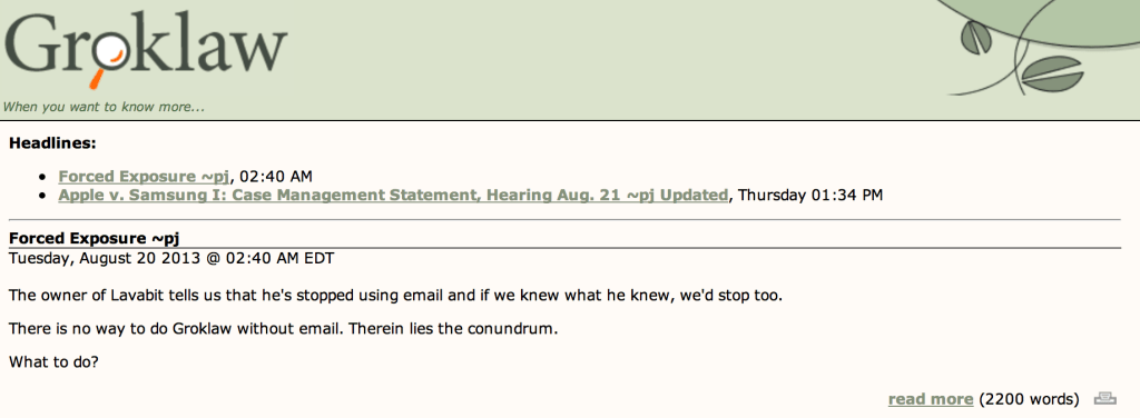 Groklaw, a decade-old law blog run by Pamela Jones, has shut down citing the danger of increased email scrutiny. “The owner of Lavabit tells us that he’s stopped using email and if we knew what he knew, we’d stop too. There is no way to do Groklaw without email. Therein lies the conundrum,” Jones wrote in a final post.