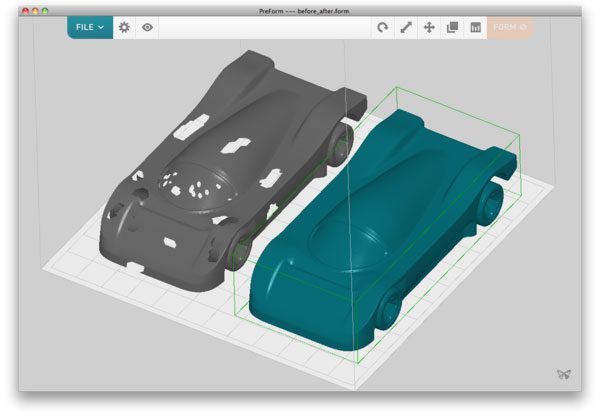 The new software also supports automatic mesh repair using software from NetFabb. Writes Sam Jacoby of Formlabs: “PreForm’s mesh repair tool integrates software from Netfabb to examine the triangle meshes that make up your digital design. It will automatically clean up artifacts, close triangles, and join vertices, so that your models will print reliably on the Form 1.” This means prints will be far smoother than they were in earlier versions of the software.