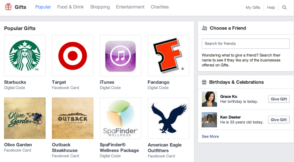 With time, Facebook saw that only 20% of total Gift sales were for physical products, while gift credits to Starbucks and iTunes were the biggest sellers. It turned out it was difficult to recommend specific products to buy for friends. However, Facebook’s data on people’s interests, location, and social graph made it easy to recommend whole brands or businesses to buy friends digital gift codes and Facebook Gift Card credit.