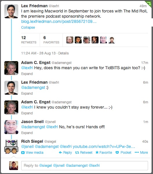 Note the timestamps along the side. Instead of the traditional ‘countdown’ as you go up, the tweets actually get older, not newer. This is a reversal of the way that Twitter has worked before. And, at least to my eye, it’s much easier to follow conversations when you’re reading them chronologically from the oldest tweet through replies that add to the discussion.