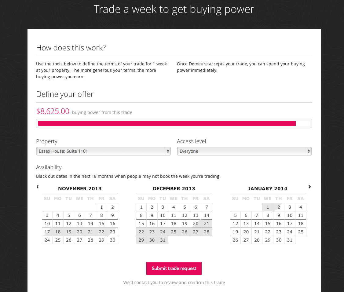 Instead, the startup offers perks such as booking priority and exclusive properties to travelers for a premium plan of $495/year. From the other side, property plans range from $495/year to $995/year. Property owners can also trade empty nights for currency through Demeure.