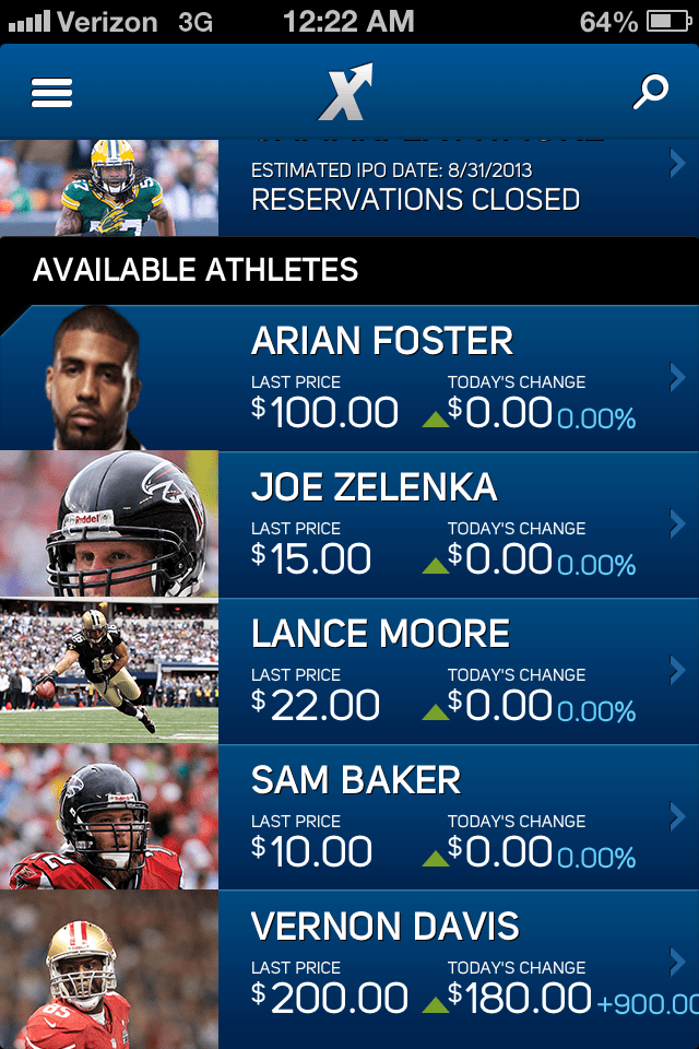 At the time of publication there were nine athletes, all NFL players, available for Fantex IPOs in the now-removed app, including high profile stars Arian Foster and Vernon Davis.