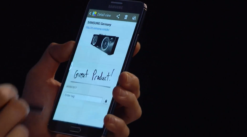 The new S Pen is designed to work with the larger screen. Samsung called it the “key” to unlocking Note features and power. This works via a number of new interface controls. There’s a dot on-screen that appears when you can activate “Air Command,” which is a tool wheel that provides quick access to memo, scrapbooking, screenwriting, and a finder search function. There’s also something Samsung calls “circle,” which uses a circle drawing gesture to capture content you want to save to your scrapbook, as called up via Air Command. Box is a way to multitask, that lets you do two things at once via essentially a picture-in-picture interface.