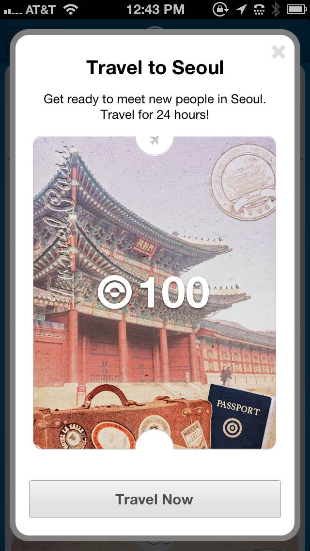 The Travel feature is a paid premium feature, where Skout users can spend a little bit of virtual currency to meet users in another city. (Normally, you are only connected to users near you.)