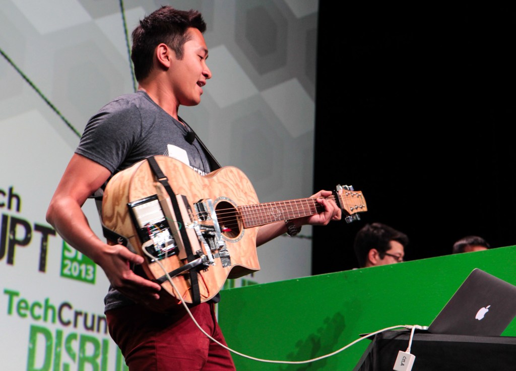 Yu Jiang Tham may not have rhythm, but that didn’t stop him from getting up on the TechCrunch Disrupt Hackathon stage and singing “Country Roads,” thanks to his self-strumming guitar, Strumbot.