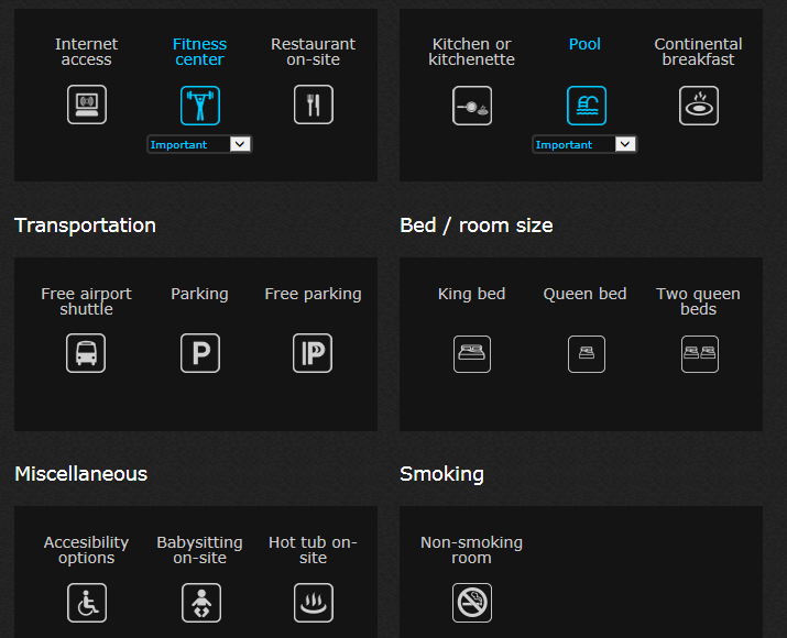 Then come the amenities, such as a fitness center, Wi-Fi, continental breakfast and more. Each of these can be ranked from unimportant to mandatory. Throw in travel options, bed and room size, a couple more options and you’ve got a complete OLSET profile. You can also import your travel profile from sites like Expedia or Orbitz in order to consider past hotels you’ve stayed in.