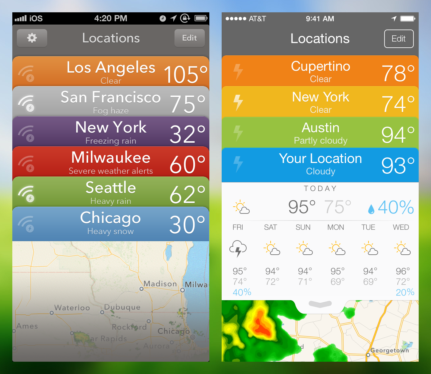 “Thankfully, Perfect Weather was one of those rare cases where just tweaking the visuals made it feel right at home on iOS 7. We had already settled on a gesture based UI that uses depth and physics in a way similar to iOS 7, so we didn’t actually have to rethink the app for iOS 7,” Barnard says. “A lot of developers will probably say the same thing and be wrong, but I think time will prove that Perfect Weather stands up well with the new UI paradigms of iOS 7.”