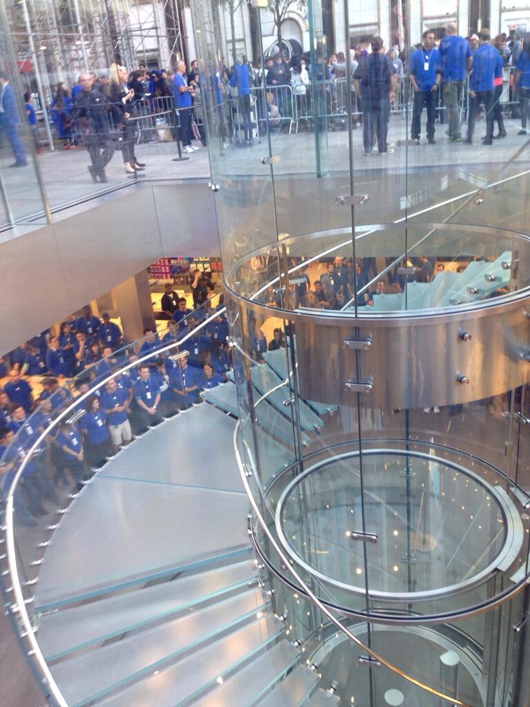 Images and video have been coming in on social media channels from around the world showing long lines at various Apple retail locations, including the following shot from TUAW depicting an army of Apple employees preparing for the deluge: