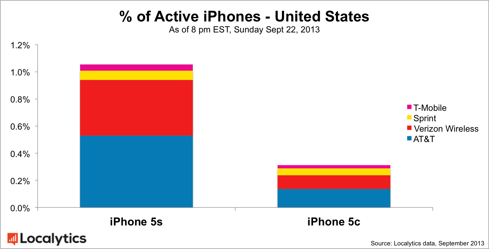 Localytics has surveyed data from over 20 million unique U.S. iPhones, beginning on iPhone 5s/5c release day on Sept. 20 and ending at 8 PM ET on Sunday, Sept. 22 to gather its results. The findings indicate that both devices have had a strong opening weekend, when you consider that the most recent generation of iPads, including the 4th gen iPad and the iPad mini, accounted for around just 4 percent of all iPad traffic a full month after its launch.