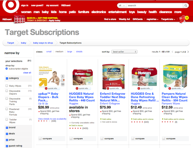 The subscription-based service is clearly Target’s answer to Amazon.com’s own “Subscribe and Save” program, which also lets shoppers subscribe to regularly used items. With Amazon’s program, customers receive free shipping, and discounts of up to 15 percent when they have five or more subscriptions arriving monthly. Target Subscriptions, meanwhile, also offers free shipping, but isn’t currently touting any particular deals beyond its usual “price cuts” on select items. (At launch, there are just two deals available – both on baby wipes.)