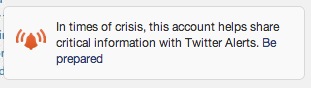 To subscribe to alerts, you can visit the alert page of an organization at Twitter.com/[account]/alerts/. If you want to see if an organization is enrolled, check their profile page to see the alerts badge along the left hand side. A link there will let you sign up.