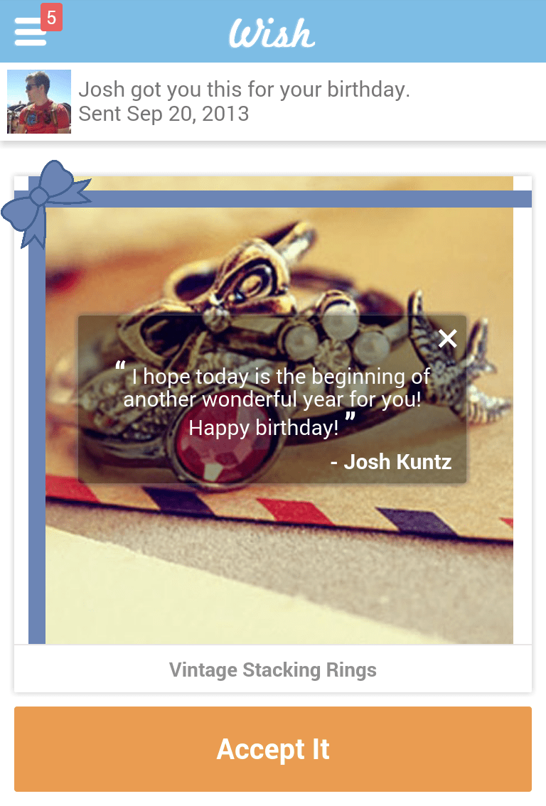 As Szulczewski explained, the Wish demographic skews toward the young and female. Gifting is a way to access an older demographic, like fathers who don’t really know what to buy their daughters, nieces, or granddaughters. While there are a slew of gifting apps out there — like Giftly for gift cards, the locally-focused Yiftee, Karma, and Wrapp — the fact that Wish draws on pre-existing knowledge of the recipient’s likes ups the giver’s odds of nailing it.