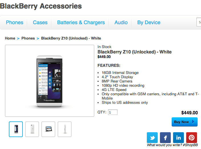 Well that was quick: Not long after T-Mobile announced it would stop carrying BlackBerry hardware in its retail stores (but continue selling them online), the Canadian smartphone maker has revealed a new direct selling model that it likely hopes will shore up that retail channel loss. BlackBerry now offers unlocked Q10 and Z10 smartphones via its own site, for $549.00 and $449.00 respectively.