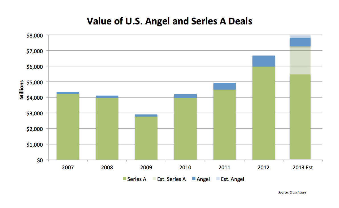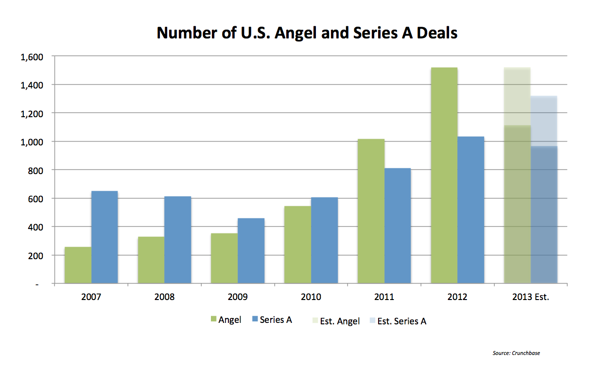 Angel investing in the US this year looks like it’s falling back towards 2011 levels, after a record 2012. Meanwhile, there are more Series A rounds than ever, based on our latest CrunchBase data. The much-feared “Series A Crunch” has yet to materialize.