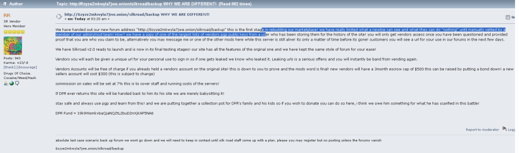 In an interesting post-mortem release by the creators of the defunct anonymous marketplace Atlantis there is information that the former admins and users of the Silk Road are planning to resurrect the service. User RR writes: “We have SilkRoad v2.0 ready to launch and is now in its final testing stages. Our site has all the features of the original one and we have kept the same style of forum for your ease.”