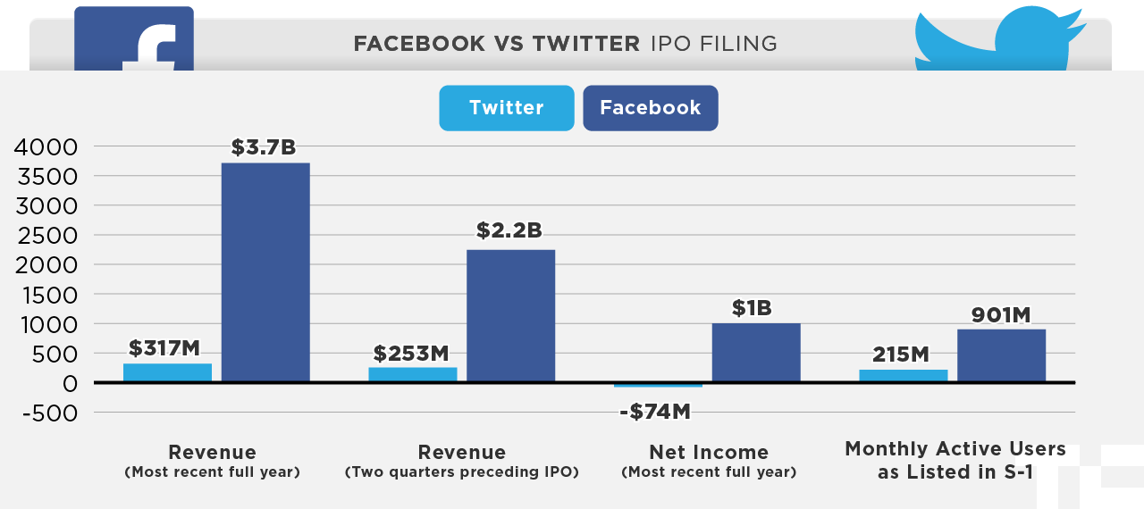 The difference between the two is Twitter’s glaring negative sign on its net income. That’s right — Twitter is losing money, where at least Facebook was turning a profit at their IPO.