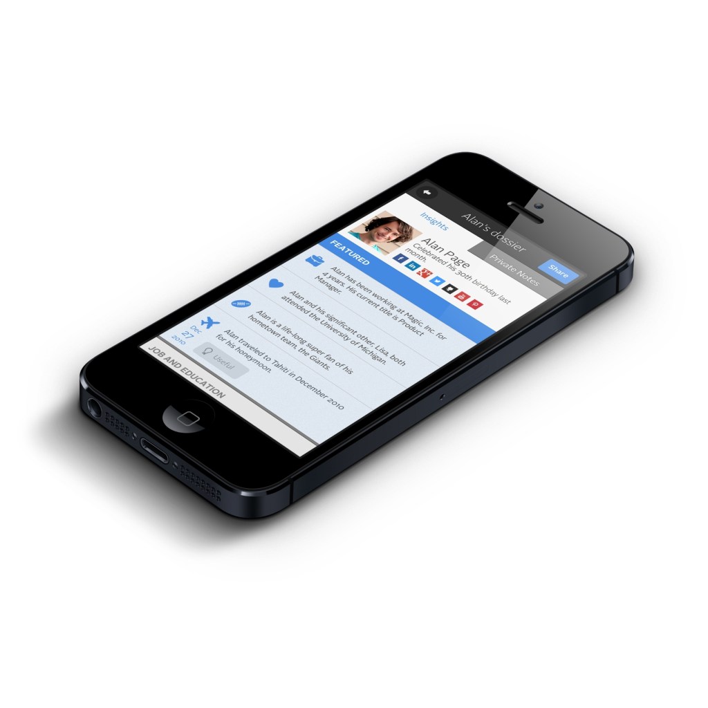 At the heart of the app is a real-time “insight engine,” which was designed to pull information from hundreds of sources and surface relevant data. As a result, each dossier is completely personalized for the user who’s viewing it based on information in common.