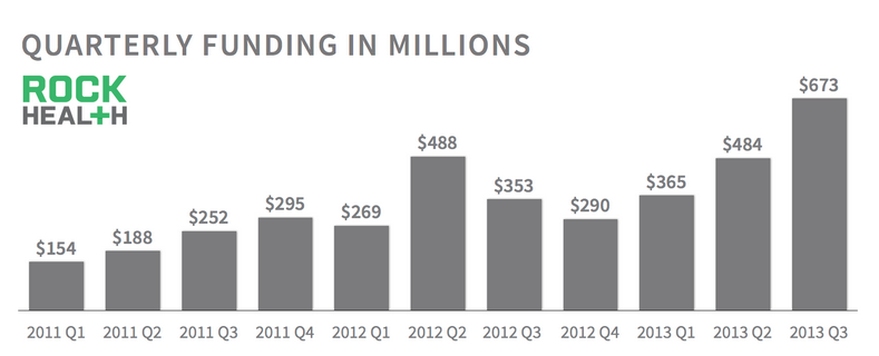 On the bright side, Rock Health’s third-quarter analysis found that venture funding is again on the rise, with $1.5 billion flowing into digital health so far this year. This means that funding is up 37 percent relative to Q3 2012 on a total of 145 deals since the first of the year. The space also saw an uptick of big investments from venture firms in Q3, with Evolent Health’s $100 million raise leading the way.