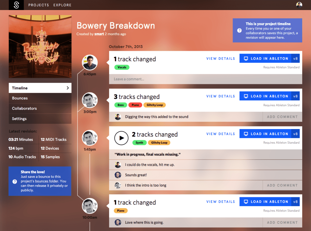This save along with details of what tracks are in the file are added to the user’s Splice timeline. They can revert back to any of their saves, essentially going back in time. To share a project with collaborators, there’s no need to send seas of Dropbox files, MegaUpload-style links, or physical hard drives anywhere. The project creator just adds their co-conspirator’s email address to Splice and they get access to all the saves and Timeline.