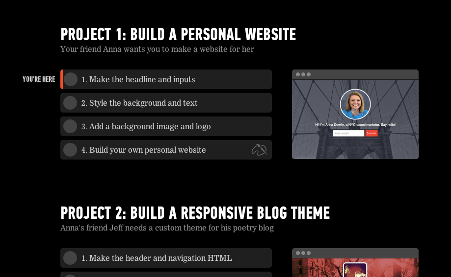 Each Dash project is framed as a task from a fictional client, with corrections along the way in case you make a mistake. But it goes beyond that. Once you’ve completed a project for your client, users can then customize the website and focus on design. After each site is beautified, Dash helps you publish it to the web.