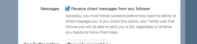 This eliminates the age-old hassle of receiving @-replies that ask you to follow-back so that someone can DM you some information or a message of questionable value. Sometimes, it even seems like users treat this as a DM honey-pot – i.e., flaunt some potentially useful information in hopes of scoring a permanent follower in return. Now, you’ll be able to receive DMs from anyone who follows you, so long as you go into your Twitter account’s main settings page and check the box that allows it.