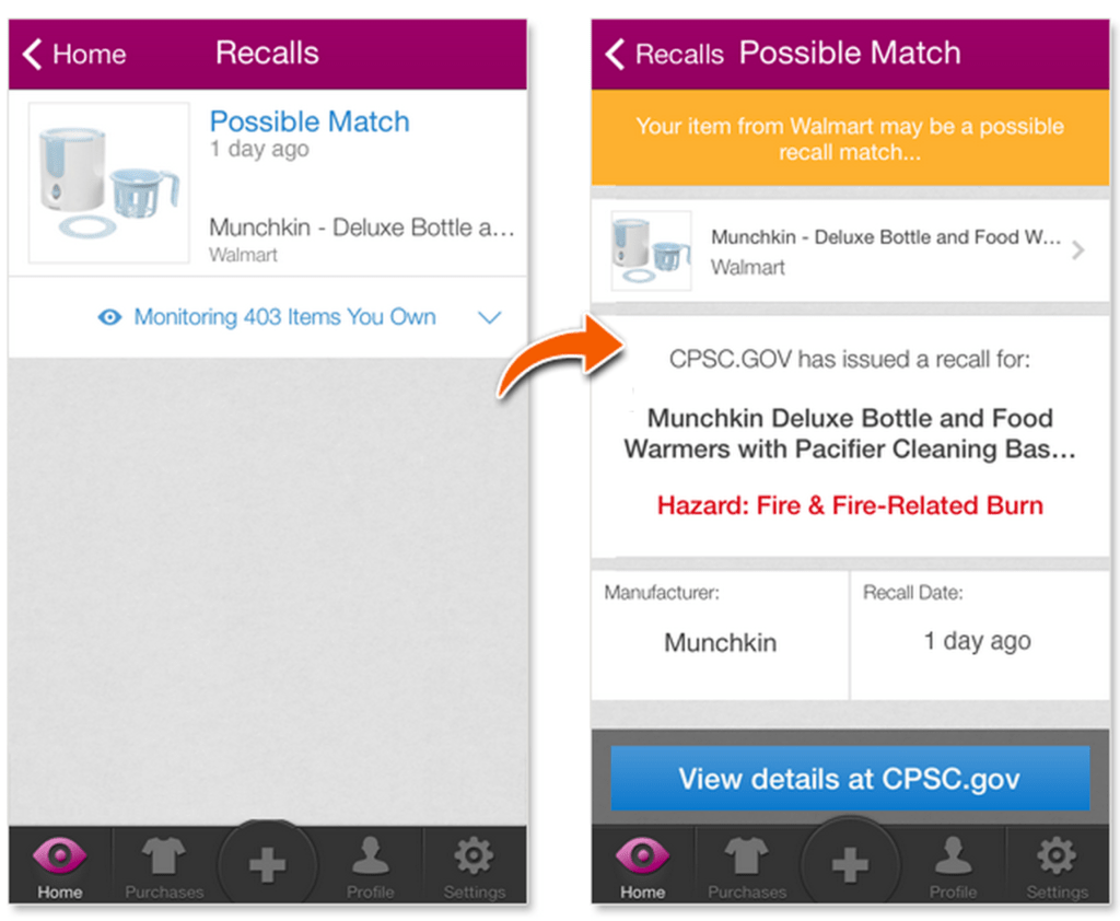 In the case that a match is found, Slice will send out a push notification in the app and/or email, depending on your settings. These will also link directly to the CPSC.gov recall page for access to the details of the product hazard in question as well as the list of steps to take next, and they include customer service phone numbers.