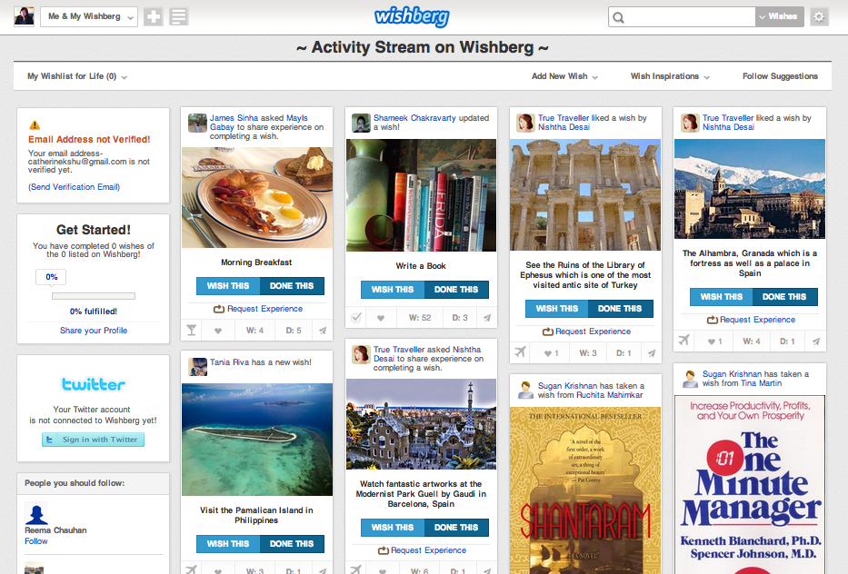 Based in Mumbai, Wishberg gives users a platform to share wishes ranging from material desires (“Buy an iPad Mini”) to loftier goals (“Climb Mount Everest”). There are similar online communities such as Web sites BucketList.org and Drimmit, and a lot of people also use Pinterest to make lists of things they want to buy or save motivational articles and art. Wishberg wants to differentiate itself by focusing on features that help users manage and achieve goals. For example, the site lets people share their progress on a goal, create a timeline of when they want it to be fulfilled or post their experiences once they complete something. Trending wishes give a look into the Wishberg community’s most popular goals.