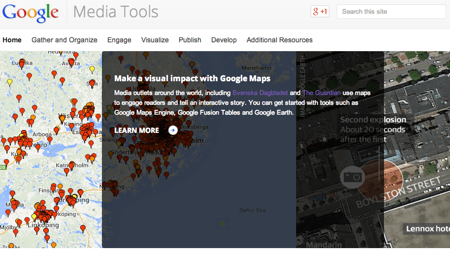 The Google Media Tools site is more than just a collection of links pointing to other properties under the Google umbrella. Instead, it has subdivided sections where reporters can dive into various topics they’re interested in to better learn the details of how things like Google’s Transparency Report work, or to learn how to get started using the Google Maps API to build customized maps and better visualize data.