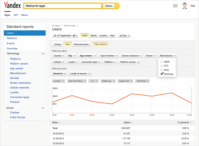 “We are thinking about that,” a Yandex spokesman told TechCrunch. “Working on more reports, including marketing staff, advanced in-app events report, and also some unique reports like ‘heat map’ of user conversions by tap or by swipe (like click map we show in old good Yandex.Metrica for Websites).”