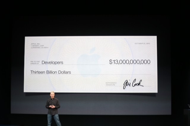 The iOS App Store now has over a million apps, which have been downloaded 60 billion times. The news broke this morning at the Apple event taking place at San Francisco’s Yerba Buena Center for the Arts, when CEO Tim Cook took the stage, prefacing the day’s announcements with a recap of the traction Apple is seeing with the new iPhones and iOS 7 adoption. And as always, he gave a shout out to the developer community with an update on how much Apple has paid out. That number? Today, it’s $13 billion dollars, says Cook.