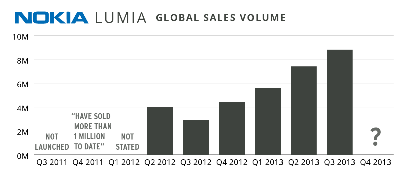 From that point, Lumia sales have expanded in each sequential quarter, from 4.4 million in the third quarter of 2012, to 8.8 million in the third of 2013, Nokia’s most recent quarter. Here’s the chart, so you have the full picture: