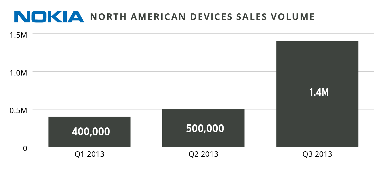 Nokia’s device unit volume in North America spiked from 500,000 units in the second quarter of 2013 to 1.4 million devices in the third. For comparison, in the first quarter of this year, Nokia shipped 400,000 devices in North America. In the year ago third quarter, that figure was 300,000. To therefore have Nokia almost triple its volume in the region in a single quarter, comparing sequentially, is more than surprising.